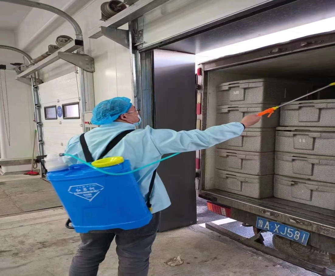為保證食品安全和員工自身安全,金德利團餐公司、供應(yīng)鏈公司每天都堅持消毒環(huán)節(jié)的打卡監(jiān)督管理。進入公司園區(qū)的車輛嚴格進行消殺,大噴霧器對進出車輛進行消殺、登記;對接車間具體負責(zé)人安排專人對食品箱進行消殺。